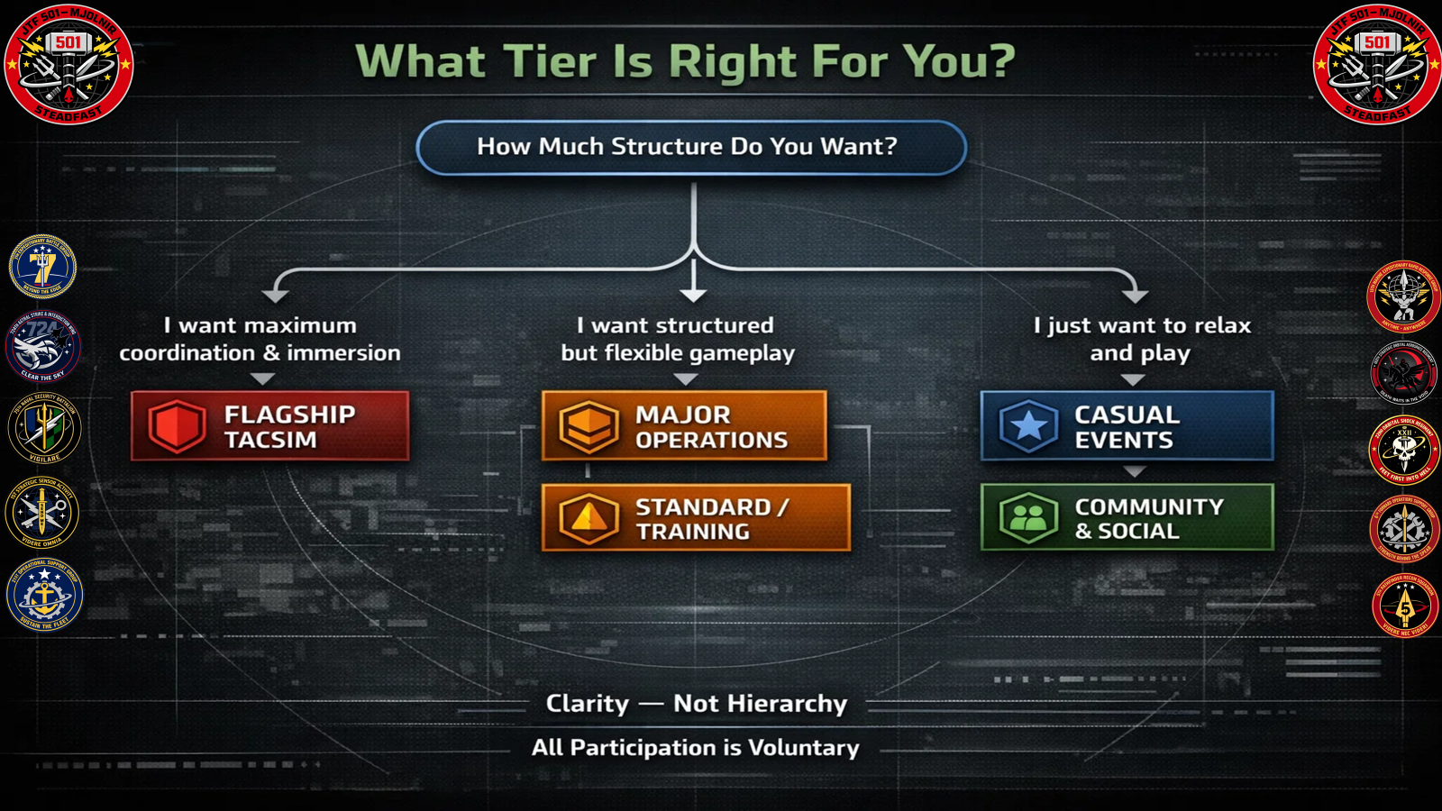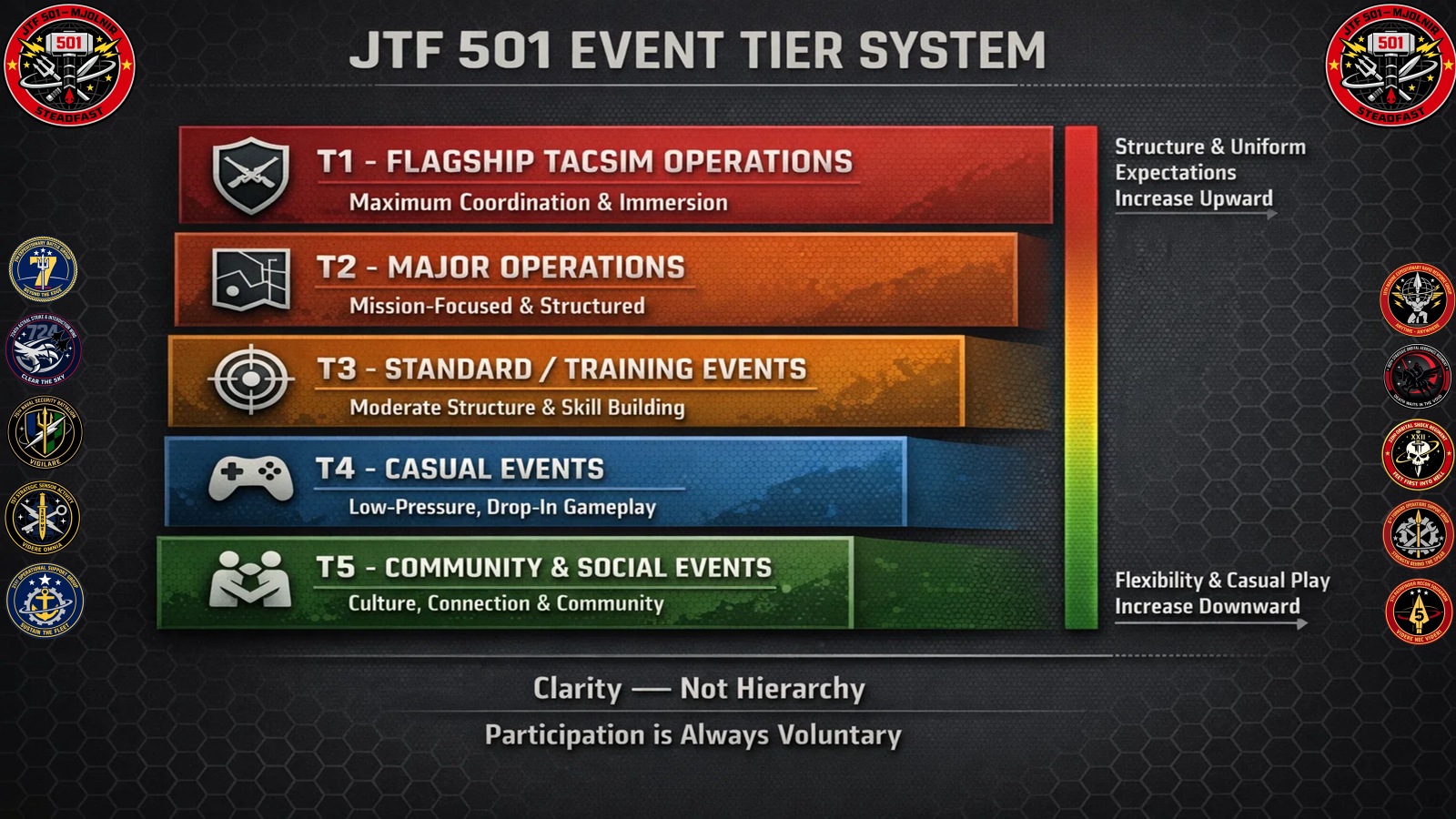We use a simple tier model to set expectations for how each event will feel—ranging from casual, low-structure gameplay to fully coordinated operations.