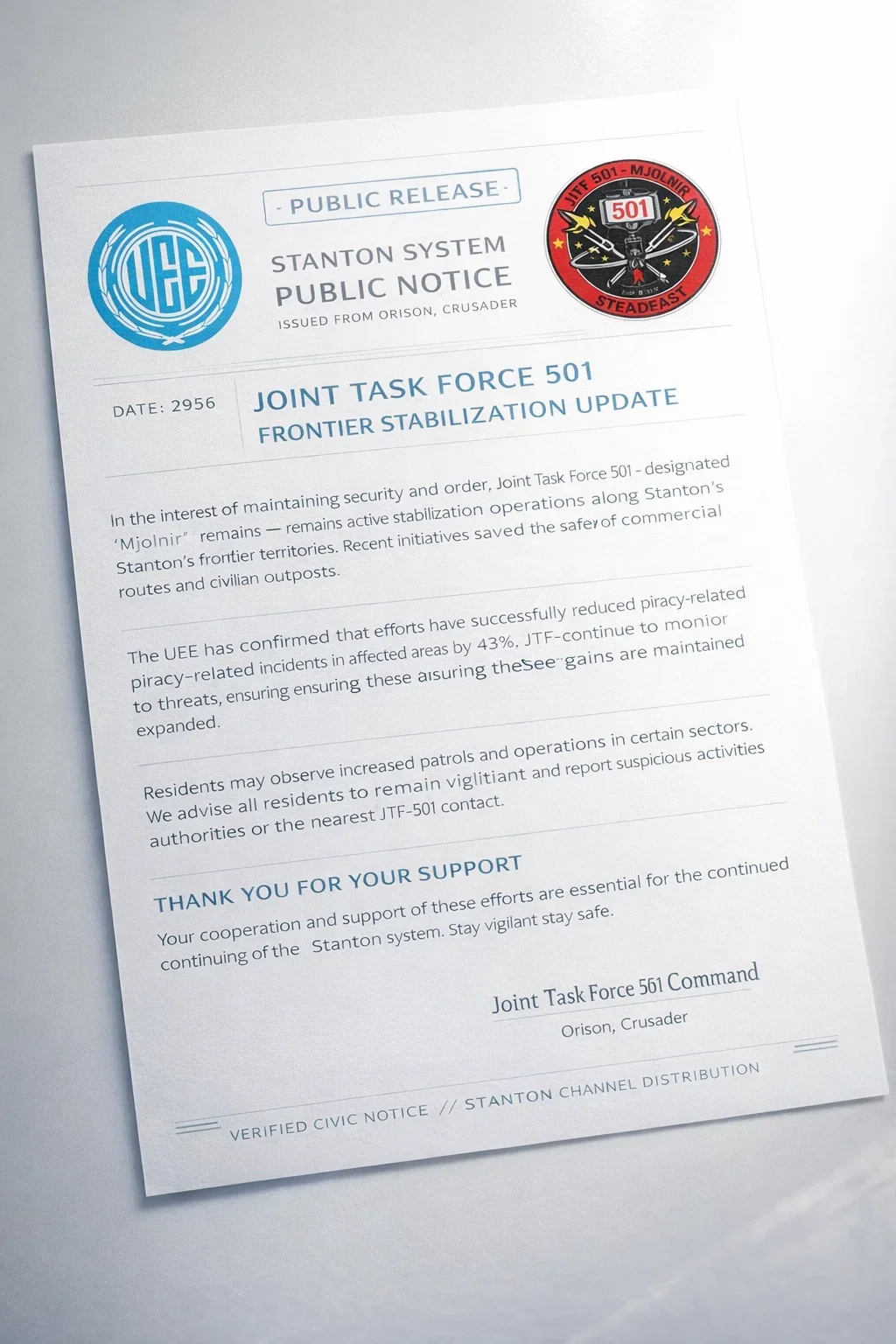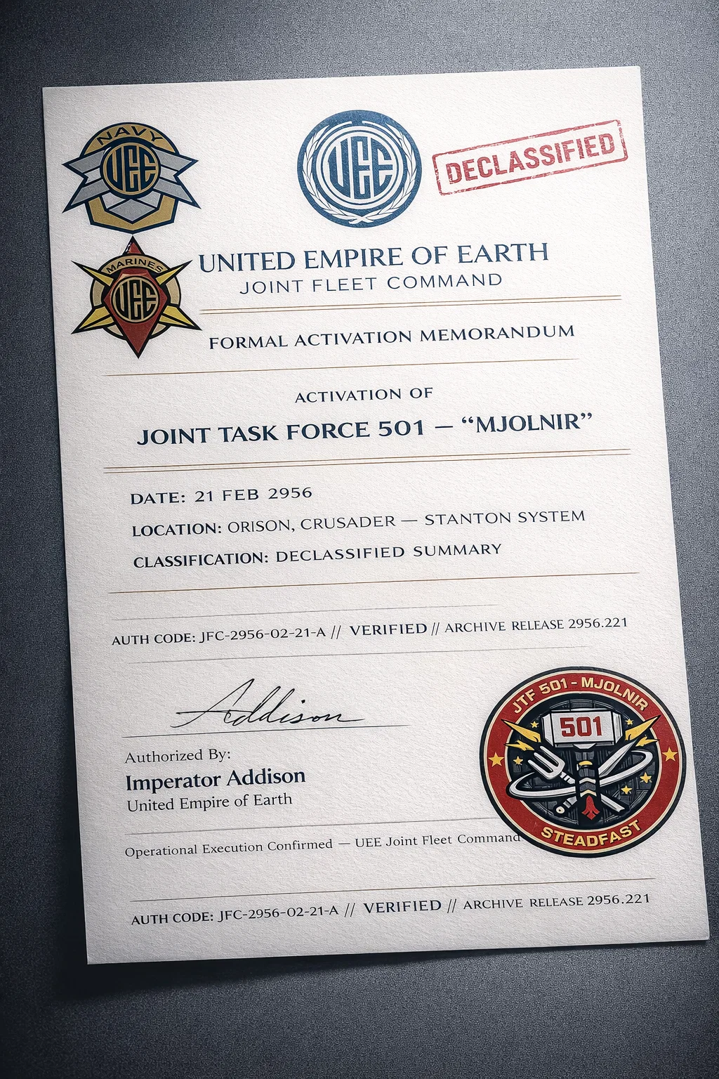 By authority of Joint Fleet Command, under mandate of the Office of the Imperator, Joint Task Force 501 (JTF-501) is hereby activated as a UEE-affiliated joint operational formation.