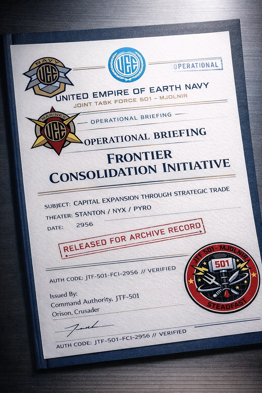 In response to destabilization within Pyro, Frontier-aligned insurgent activity, renewed Vanduul probing actions, and evolving conditions in Nyx, Joint Fleet Command authorizes a scalable joint element capable of stabilizing frontier space without full battlegroup deployment.